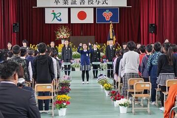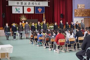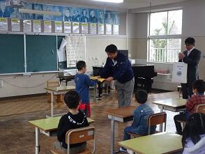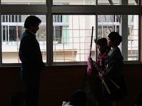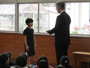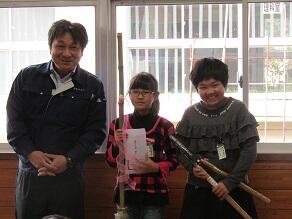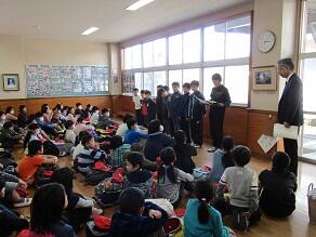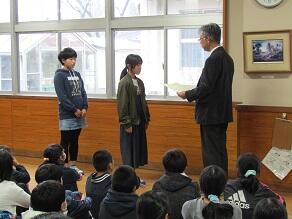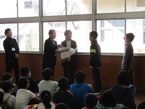 12月19日(水) この日は小林ライオンズクラブから清掃用具等の寄贈がありました。集団下校の会で生徒指導主事の先生のお話のあと、寄贈式を行いました。小林ライオンズクラブの方が品物を児童代表者2名に手渡されました。代表児童からお礼の言葉を言いました。最後に、全員で「ありがとうございました。」とお礼を言いました。小林ライオンズクラブは昭和53年(1978年)から毎年、市内の小中学校へ寄贈しているそうで、今年度で40年になるそうです。今年は竹ほうき13本と苅込ハサミ1個をいただきました。竹ほうきは消耗頻度が高いので、こうやって毎年いただけるのは、本当にありがたいことです。大切に使わせていただきます。