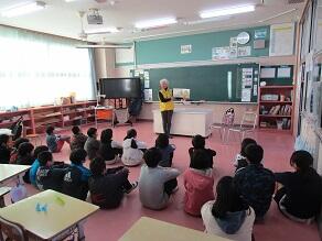 5月28日(火)。2・3校時に交通安全教室を実施しました。本来ならば運動場で実施の予定でしたが、雨のため体育館での交通安全教室となりました。