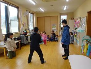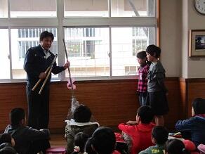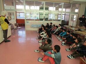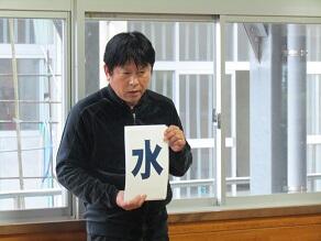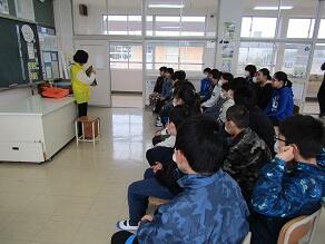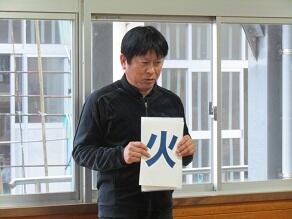 教室からの避難が完了後は、野尻分遣所の方に、火災についての話を聞いたり、水消火器による消火訓練を行ったりしました。