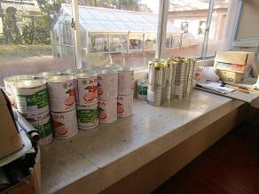 ・材料です。 竹です。       ・給食センターからいただいた缶です。  ・土と飾りの植物です。      ・作業手順の説明書です。