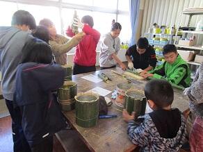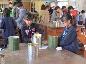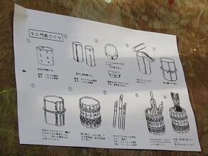 ・講師の方から説明を受けます。        ・竹切りです。お父さんがんばっています!  ・竹を缶の周りにつけていきます。