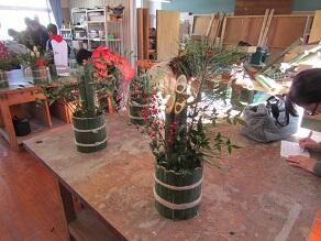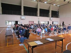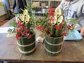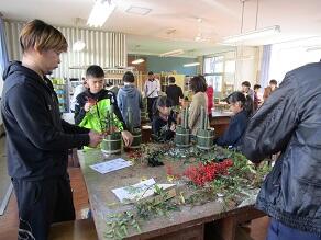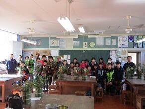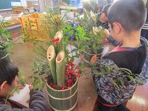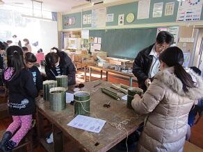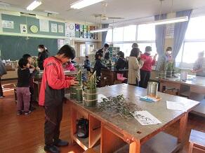 12月15日(土) この日は小中合同家庭教育学級の日でした。今回は「親子ミニ門松づくり」を行いました。講師には8月の木工作品作りでも来ていただいた、森 木材工業の方に再びお願いしました。8月に比べて倍以上の参加人数でした。作業の手順等の説明の後、いよいよ開始です。はじめに土台の缶の周りを囲む竹を切る作業です。お父さん方に協力していただき、缶の高さより少し長めに竹を切り、その後、縦に割りました。割った竹を缶の周りに付け、ヒモでしばります。その後立てる竹を切りました。ここでは中学生のお兄ちゃんが活躍しました。切った竹を3つ合わせ、その後、土を入れて固定。最後に松や南天などの植物を飾ってできあがりです。親子で協力しながら、楽しく作業ができたようです。完成品も素晴らしいできでした。2時間ほどの活動でしたが、親子でワイワイ、ガヤガヤ・・・。とても良い時間でした。早速、玄関に飾ってあるのではないでしょうか?森 工業の方2回にわたり、ご指導ありがとうございました。材料の竹切りにご協力いただいた中学校の保護者の方、ありがとうございました。次回はもう最終回で、2月の閉級式となっています。多数の参加、お待ちしています。