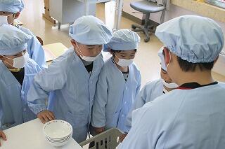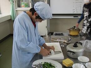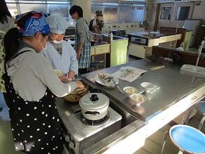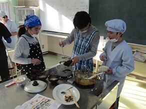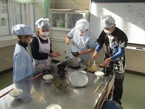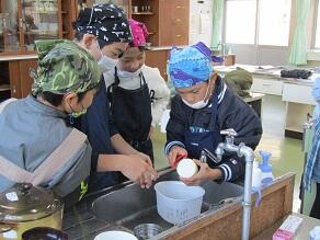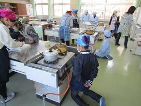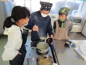 12月19日(水) この日5年生が調理実習を行いました。献立は「ご飯とみそ汁」でした。食の基本のようなご飯とみそ汁づくり、さあ、どうなりましたでしょうか?(^o^) はじめにご飯を洗って(といで)、少しそのままおきます。その間にみそ汁の準備です。みそ汁の具は“大根”、“油揚げ”、“ねぎ”でした。大根は皮をむいて、いちょう切りに、油揚げは短冊切りにします。出汁は煮干しです。お家でやっているのか、みんな包丁使いが上手でした。ご飯は炊飯器ではなく、鍋で炊きました。“はじめチョロチョロ、中パッパ、◯◯泣いてもフタ取るな!”っていうのがありますね(^^) 子どもたちは楽しそうに、でも真剣に取り組んでいました。しばらくすると家庭科室は、いいにおいが充満しました。担当者のお腹も“ぐぅ~~~~”っと鳴りました(*^_^*) さて、味は・・・。大根もしっかり煮えていて、出汁がよくでていましたよ。とっても美味しいみそ汁でした。ご飯は・・・、ちょっとお焦げもありましたが、子どもたちは美味しくいただいたようです。なんてったって自分で作ったんだからね(^_^)v 冬休みにお家でチャレンジしてほしいものですね!