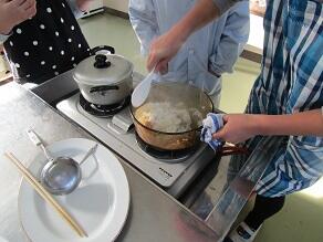 ・ご飯が炊けました・・お焦げが・・・。      ・ご飯をよそいます。お焦げが美味しそう。  ・みそ汁をつぎます。これも美味しそう!