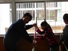 ・寄贈式です。                   ・竹ほうきにはリボンが付けてありました。   ・ハイ、こっち向いて~ パチリ!