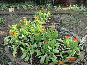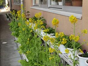 ・こちらは栽培活動で植えた、花壇の花です。キンセンカは大きく咲きました。(^^)       ・学校用務員さんが植えた菜の花です。