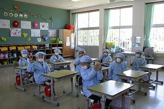1年生の給食も先週から始まり、かわいらしい給食着姿で給食当番の仕事をがんばっています。牛乳配りにお盆配り、おかず運びまで、6年生にお手伝いしてもらいながら準備し、みんなで食べる楽しい時間を過ごしています。