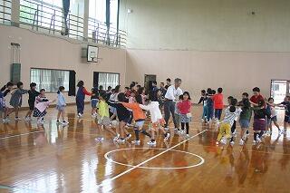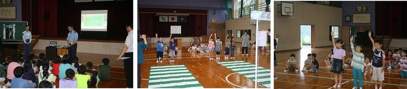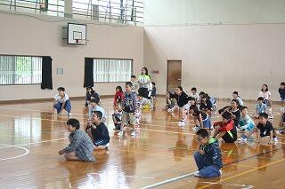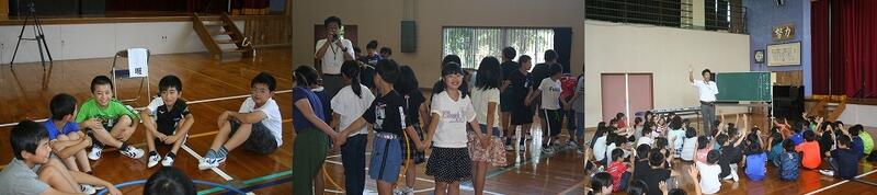 久しぶりに晴れた8月29日(木)。体育館では4~6年生が「城攻め踊り」の2回目の練習を、運動場では1~3年生が合同運動会で実施する「全員リレー」の練習を行いました。