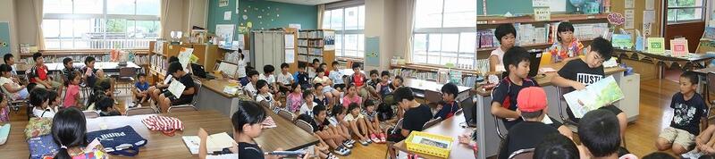 放送で呼び掛けたところたくさんの児童が図書室に集まり、図書委員よる読み聞かせを楽しみました。子どもたち同士の読み聞かせもいいものですね。