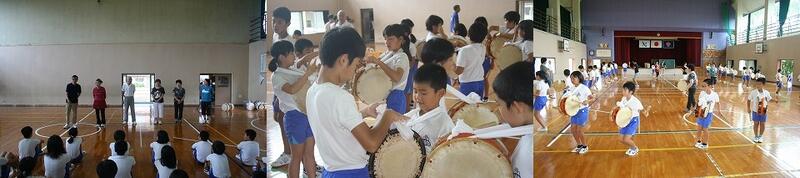 8月28日(水)。4・5・6年合同での「城攻め踊り」練習がスタートしました。6名の指導者の方を講師に迎え、1校時から4校時までみっちり練習に取り組みました。初めて太鼓を付ける4年生も、経験者の5・6年の子ども達に教えてもらいながら、1日にして大まかな形ができてきました。