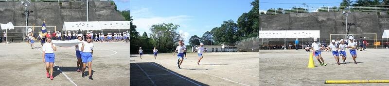 9月10日(火)。小中合同運動会の予行練習が行われました。先週は天気が不安定で、予行練習ができるかどうか心配していたのですが、10日(火)は夏の日を思わせるような青空が広がり、気温もかなり高い一日となりました。そんな中、子どもたちは一つ一つの競技に真剣に取り組み、汗を流しました。