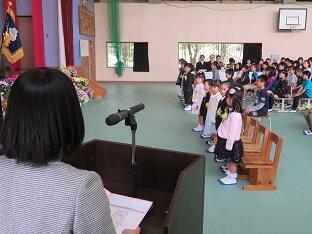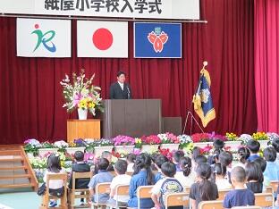 【 氏名点呼です。元気よく「ハイ!」】 【教育長先生“あ~がり目、さ~がり目、くるっと回って・・”って歌を】 【PTA会長さんからも】