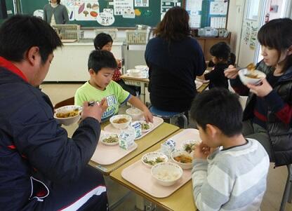 学習の後には、親子で給食。いつもは時間がかかる1年生ですが、この日は、お家の方といっしょで一層おいしかったのか、食べるのも速かったようです。