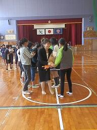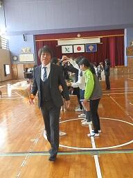 【離任式の様子】・6名の先生方です。 ・児童代表、お別れの言葉です。 ・最後の校歌の伴奏です!