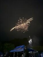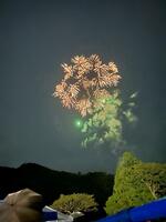 須木小児童が「すきっこソーラン」を踊るときには雨も落ちなく、力強くパフォーマンスできました。花火が上がり始める午後8時には雨が降り始めましたが、見事な花火が目の前に繰り広げられ、山間に響く花火の音はとても心地よいものでした。