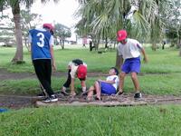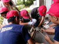 生き物クイズ(わかった!!) 宝さがし(「きっとこの辺りがあやしい」・・・、ALTのジョン先生も参加)