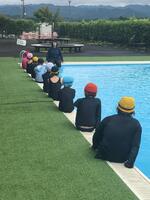 水泳の授業が始まりました。今年度も市営プールを利用しての授業です。行き帰りはバスの送迎です。ちょっぴり遠足気分かな?低学年は、市営の屋外プールで行いました。やや風があり、寒い状況でしたが、児童は元気にプールでの授業を受けていました。宝探しをしたり、輪っか潜りをしたり、水中で歌を歌ったりしながらを楽しんでいました。