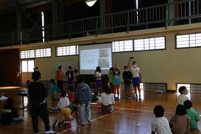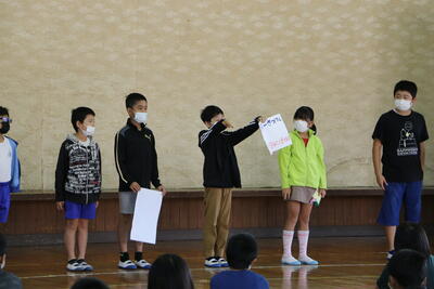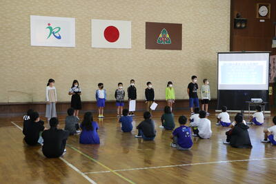 6月9日(金)に児童集会を行いました。すくすく委員会の目標は「やるべきことに気づいて行動し、須木小みんなの健康をサポートしよう」です。毎週火曜日と木曜日にはストレッチをする日ということで、みんなでストレッチを行いました。放送委員会の目標は「楽しい放送 正しい放送 分かりやすい放送」です。あいさつ名人やボランティア名人などを放送することで須木小学校のパワーアップを目指しています。図書委員会の目標は「みんなが楽しく本を読めるように活動する」です。本を借りてスタンプを集め、しおりや賞状をもらう活動を紹介しました。