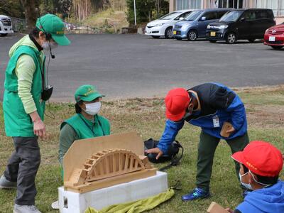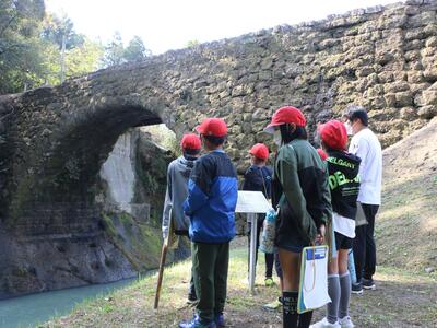 11月7日(月)に4年生は、野尻庁舎にある野尻開拓に尽力された信時金之助翁と田丸貞重翁の像の前で小林市ガイドボランティアの方からはなしを聞きました。その後、県指定文化財である東方大丸太鼓橋に行き、森山新蔵氏が建設した石造りのアーチ橋を見学し、アーチ橋の仕組みも勉強しました。最後に須木地区に移動し、児玉源七郎氏が尽力された須木の水路開発事業について話を聞きました。