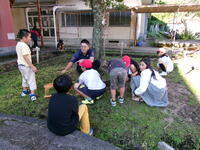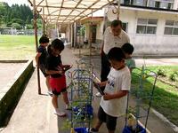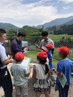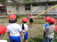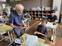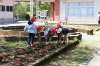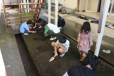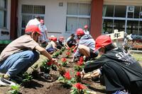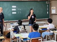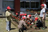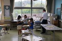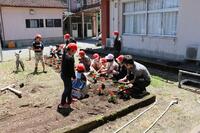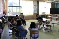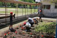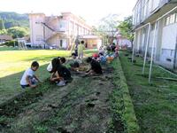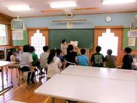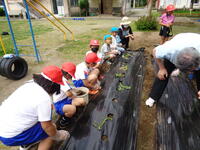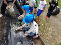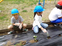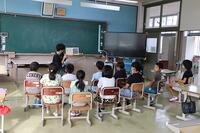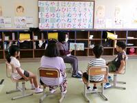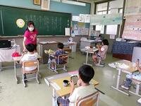 5月25日(木)に、須木中央保育園の年長さんと一緒にいもの苗植えをしました。初めてのいも苗植えで子供たちも要領をつかむのに苦労していましたが、仲良く植えることができました。秋にはまた一緒においしいお芋が収穫できるといいですね。苗を植えた後は、教室で1年生の勉強の様子を見学しました。