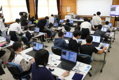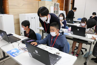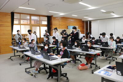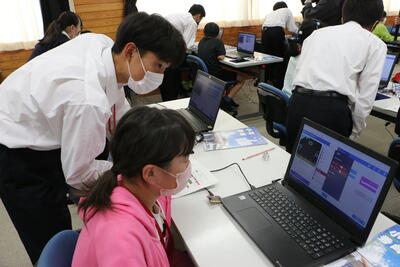 11月14日(月)に4年生から6年生は小林秀峰高校でプログラミング学習を行いました。はじめ秀峰高校の学校案内をしてもらい、後半に高校1・2年生のスタッフが中心となり、プログラミング学習を行いました。プログラミングの説明は、須木出身の生徒が講師となり説明してくれました。マイクロビットを使ってプログラミングを行い、サイコロの作成を行いました。
