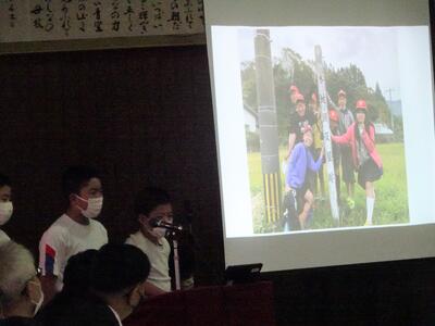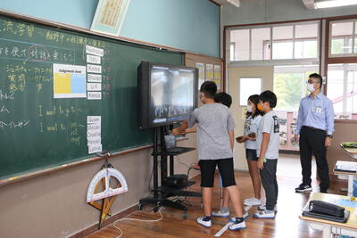 10月13日(木)5・6時間目に先日行った中学生と再び交流英語学習を行いました。今回はALTのコリンさんも交えて、細野中学校2年生、西小林中学校2年生と楽しく学習しました。2校の中学生が各国の紹介を英語で行い、須木小の5・6年生がどちらの国に行ってみたいかをジャッジする内容です。また、その説明を聞いて自分がどの国に行ってみたいかを英語で答え、最後に須木紹介プレゼンを行いました。