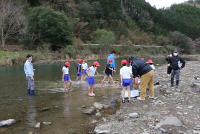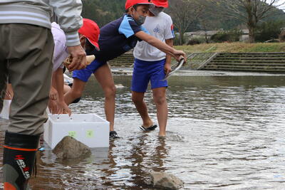11月28日(月)に須木漁業協同組合の方々の協力を得て、本庄川の河川プールの場所でウナギとモクズガニの放流を行いました。はじめに組合長さんのおはなしを聞きました。須木の本庄川にはアユやウナギ、ウグイにヤマメなどが棲息しており、水がとてもきれいな証拠であるとのお話しがありました。きれいな川を守るために本庄川が流れ込む小野湖での清掃などをしている話もされました。最後に、児童代表の加藤さんは須木の自然を守っていきたい(よごさないようにしたい)と話していました。これからもずっと川に魚や生き物が棲息できる環境を残していきたいですね。
