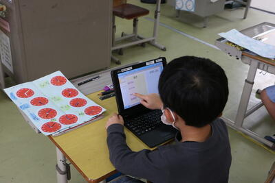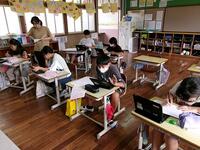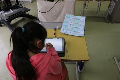 4年生は「宮崎の偉人」について調べ、プレゼンテーションにまとめています。1年生は「おうちでしている仕事」についてペンを使ったりして、タブレットにまとめています。
