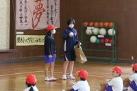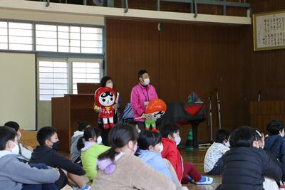 1月26日(木)にすくすく委員会が中心となって「給食感謝の会」を行いました。東方給食センターの日髙先生をお招きし、先生からのお話と感謝の贈り物をしました。先生からは、給食の野菜などは地産地消で小林産のものをつかっていることと生産者の方のお話しもしてくださいました。生産者の方からは「この野菜ってなんていう名前なのか」とか「どういう栄養があるのか」など考えながら食べて欲しいとありました。また、先生からは、つくる方としてはたくさん食べてくれて食缶が空っぽで帰ってくると大変うれしいとあり、須木小はたくさん食べてくれるのでうれしいと言ってくださいました。