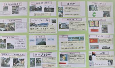 3年生は、12月に地区内の危険箇所などをまわり、タブレットで写真を撮って5人全員でまとめ、学級の廊下に掲示しました。危険箇所の他に道路標識や避難場所、こども110番なども確認しました。
