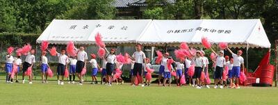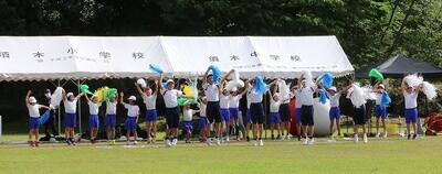 天気が心配されましたが、雲の隙間から青空も見え始め、爽やかな風の中で、第14回須木小中合同運動会が開催されました。「絆心結笑 ~心を一つに絆で勝つ END WITH SMILE~」のスローガンのもと赤団・白団ともに心を一つにした素晴らしい戦いが繰り広げられました。一生懸命に走った徒競走やリレー、全学年で踊った「すきっ子ソーラン」、そして新競技の「シン・左近太郎」や「大玉転がし」など児童が自分の団のために、そして自分のために戦った運動会でした。昨年度の運動会よりさらにパワーアップした運動会となりました。先日のグランド整備や前日準備、当日の後片付けなど保護者の方々やPTA役員の方々に協力していただき素晴らしい運動会となりました。ありがとうございました。また、来賓の皆様も早朝よりお越しいただき感謝いたします。