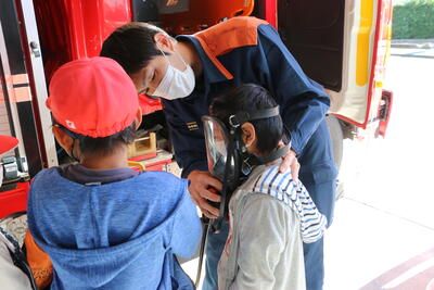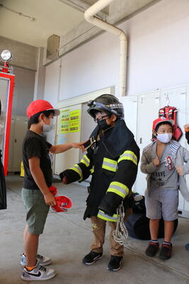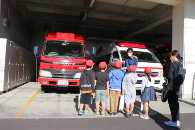 3年生は、10月19日(水)に小林市真方にある西諸広域行政事務組合の中央消防署の見学を行いました。救急車やタンク車、新しく入ったばかりの救助工作車などを見学し、消防服の着用体験も行いました。最後に、救急司令室を見学し、須木小学校から救急の連絡が来たときの話を聞きました。消防自動車や救助のことなどの質問をたくさんして多くのことを学びました。