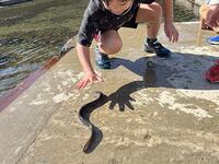 22日(水)に4年生の魚放流体験と5・6年生の福祉体験を行いました。河川環境保全に伴う魚の放流では、須木地区漁業協同組合長や須木支所の方から川魚の話を聞いた後、ウナギの放流を行いました。ウナギの放流では、ウナギを手づかみするもぬるぬるで、なかなか手の中に収まらず、慌てて放流するなど、普段経験したことのない体験をしました。その後、釣り体験を行いましたが、釣果は得られませんでした。残念。