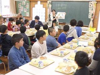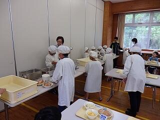 普段の教室の食事とは違い、他の学年の人と並んで食べることで、給食時間の楽しさも倍増です。給食担当の先生のお話を聞いた後、楽しい食事時間を過ごすことができました。