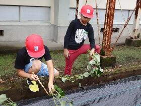 先週の5年生に引き続き、今日は1・2年生が、いもの苗植えに挑戦しました。