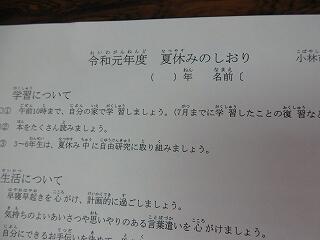 さあ、夏休みです。今日配られた、夏休みのしおり(ピンクの紙)をいつも見えるところに張って、しっかり読んで、決まりを守って、楽しい夏休みにして下さい。