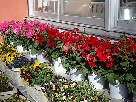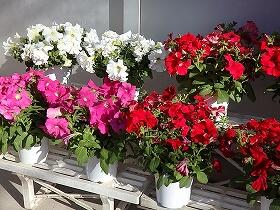 学校に、色とりどりのペチュニアの花鉢が届きました。