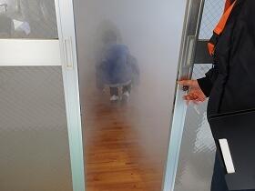 その後、煙体験をしました。訓練用の安全な煙ということでしたが、中に入ると、真っ白で何も見えなくなる怖さをしっかり体験することができました。