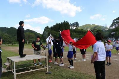 25日(土)に小中合同運動会が行われました。1週間程前までは天気が心配されましたが、前日準備から当日まで大変良い天気に恵まれました。当日早朝は霧が立ち込め、真っ白な状態でしたが、次第に霧が晴れ、雲一つない素晴らしい青空となりました。予想気温が高く、熱中症等が心配されましたが、大きなけがや事故もなく素晴らしい運動会となりました。小学生も中学生も、力いっぱい演技や団技、徒走やリレーを頑張りました。赤白の応援も工夫を凝らし、素晴らしいものでした。自分たちの団の勝利のために一人一人が精いっぱい力の限り頑張りました。「やればできる」という思いを今後の学校生活に生かしてほしいと思います。