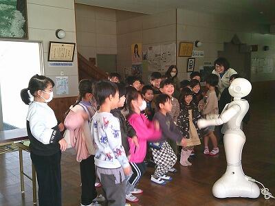 新年を迎えて、2学期の後半がスタートしました。そして、ペッパーくんが飯野小学校にやってきました。早速、1年生が、ペッパーくんとラジオ体操をして楽しんでいました。1月は飯野小学校の子どもたちが、ペッパーくんと話したりプログラミンで楽しんだりします。