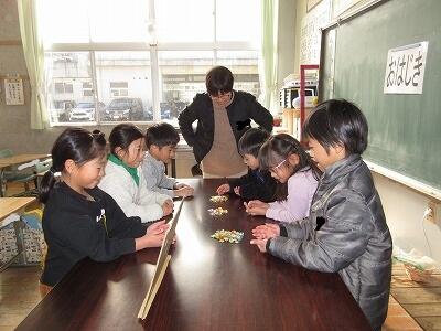 1年生が生活科で、めんこ、あやとり、お手玉、竹馬、おはじき、けん玉、こま回し、折紙などの遊びを、名人から教えていただきました。たくさんのボランティアの方々が「名人」としてお力を貸していただいたお陰で、1年生は、名人と対話をしながら、やり方やコツを丁寧に何度も教えていただき、楽しむことができました。