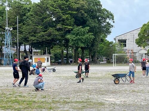 飯野小学校は「やまびこ会」の皆様によって、倒木、枝折れ落下、枯れ木、グラウンドの凸凹などの緊急対応や、PTA親子クリーン活動では対応できない環境整備等を行っていただいています。昨日は、利用していない花壇の撤去、枯れ木の伐採、積まれた枝草の撤去運搬等をしていただきました。暑い中でしたが、黙々と作業を進めてくださり、午前中で見違えるようにすっきりとした環境になりました。出入りの際に花壇に躓く心配もなくなりました。「やまびこ会」の皆様、本当にありがとうございました。