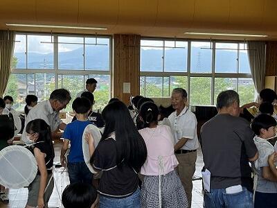 6年生の子どもたちが、最高の思い出づくりができるようにと、レクリエーションが行われました。「サマートリップ」略して「サマトリ」に、多くの6年生と保護者が参加しました。「スプラッシュバトル」「すいか割り・食べる」「カレー作り・食べる」「アジャタ」など大いに盛り上がりました。夜には、スーパー助っ人の「やまびこ会」の協力を得て「肝試し」と「日本一小さな花火大会」が行われました。実行委員の皆様には、何度も協議を重ねて準備をしていただきました。最高の思い出になる1日です。本当にありがとうございました。