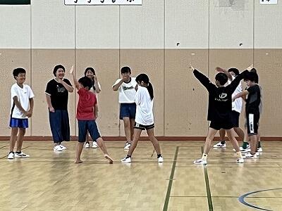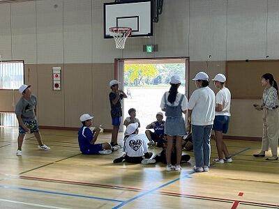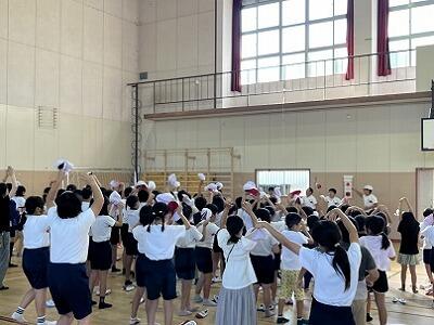 運動会で3・4年生が「えびの音頭」を踊ります。今日は、支援ボランティアの方から、えびの音頭の制作に関わることや振り付けの意味等を教えていただきました。その後、支援ボランティアの方の踊りを手本に、何度か練習をしました。とてもわかりやすく教えていただきました。運動会当日に、ご来場いただいた皆様といっしょに踊るのが楽しみです。