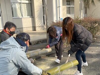 一年の幸福を祈願して門松づくりが行われました。前日までに準備していただいた竹を切ったり磨いたりを、やまびこ会の皆様に教えていただきながら職員も体験しました。飯野小学校は、正門を含めて4つの門があり、それぞれの門から子どもたちが登校してきます。そのため4つの門全てに、門松を作ってくださいました。一つ一つの作業を皆で楽しみながら行い、笑顔がいっぱい詰まった門松になりました。学校全体もこの門松で福に包まれました。作業後は、学校運営協議会の方がつくってくださった、熱々サクサクの唐揚げと具沢山の豪華豚汁で満たされました。この一年多くの方に支えていただき、おかげさまで来年も皆でよい年を迎えられます。本当にありがとうございました。
