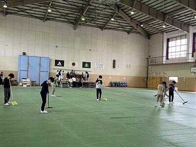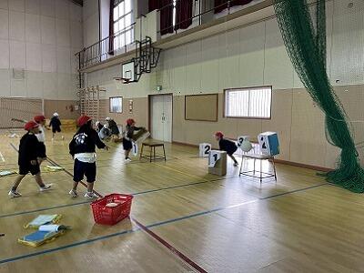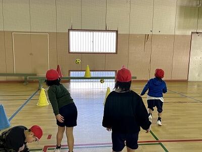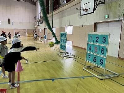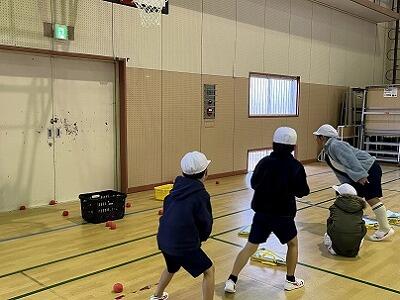 霧島連山が雪で白くなっています。大変寒い日ですが、1年生が多様な的当てにチャレンジしていました。的に応じて、ボールの大きさも変えてあるため、子どもたちはどうやって投げたらいいか考えながら試していました。ボールを投げることへの得手不得手より、的に当てたり倒したり、箱に入れたりすることに集中して、楽しんで投げていました。