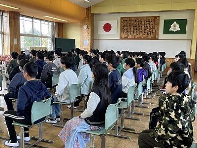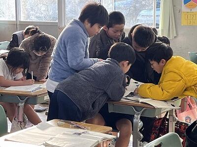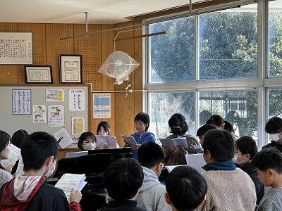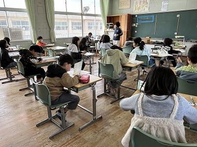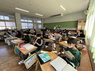 2年生が、国語の授業で、山場のはじまりはどこか、根拠を示しながら話し合っていました。どのグループも、言葉や前の時間のポイントを活かして考えていました。他の班の発表にも、真剣に聞きっています。また、4年生と5年生は、卒業式の別れの歌を合同で練習していました。在校生代表、最上級生としての気持ちや態度につながっていきます。
