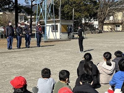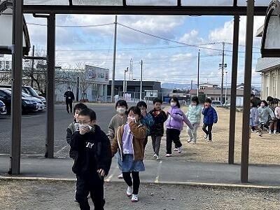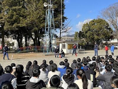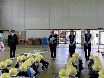 火災を想定した避難訓練を行いました。各教室から運動場へ避難した後、火災の際の対応の仕方や注意することなどを、消防署の方からご指導いただきました。また、水消火器を使った初期消火を、6年生3名が代表して体験しました。最後に6年代表児童が「実際に学べて良かった。これから活かしたい。」と感想を述べました。火災を防ぐことはもちろん、遭遇した際に今回の訓練を活かした行動をして、命を守って欲しいです。