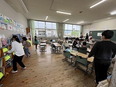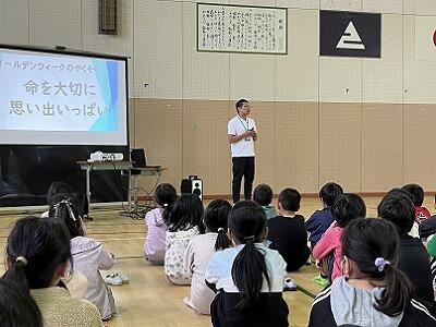 4月、新しい学級・学年で、みんなよくがんばりました。朝からボランティア活動や委員会活動をしている6年生、5年生、本当にありがとう。「命を大切に、思い出いっぱい」の連休になるように、大切な約束について、生徒指導主事が全校朝会で話をしました。話す人を見て、しっかりと聞いていました。約束を守って、連休明けに元気に登校してくるのを待っています。