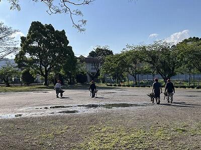 やまびこ会の皆様に、噴水、池の清掃に加えて、プール北側の樹木伐採作業をしていただきました。毎年、噴水と池の掃除をしていただいていますが、今回は、プール北側のフェンスとバックネットの間にあった樹木も伐採していただきました。バックネットとフェンスに当たらないように、クレーンを使っての大作業でしたが、熟練の技と機材、多くの協力者があり、手際よく安全に作業をしていただきました。また、伐採した樹木の枝葉は、すべて機械で砕いてチップにし、草が生えにくいように花壇に敷き詰めました。SDGsの環境整備でした。これでプールも落ち葉で悩まされることがなくなります。年度末の多用な時にも関わらず、計画・実行していただいたやまびこ会長、会員と職員の皆様、本当にありがとうございました。